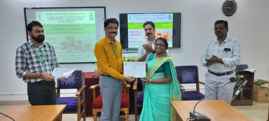 The 6-day training programme on Entrepreneurship Development in Food Processing concluded on 20 September 2025 as a grand success under AICRP on PHET, Department of PFE. Certificates were awarded by Dr. Jayan P R, Dean of Faculty (Agrl. Engg.), KCAEFT-Tavanur